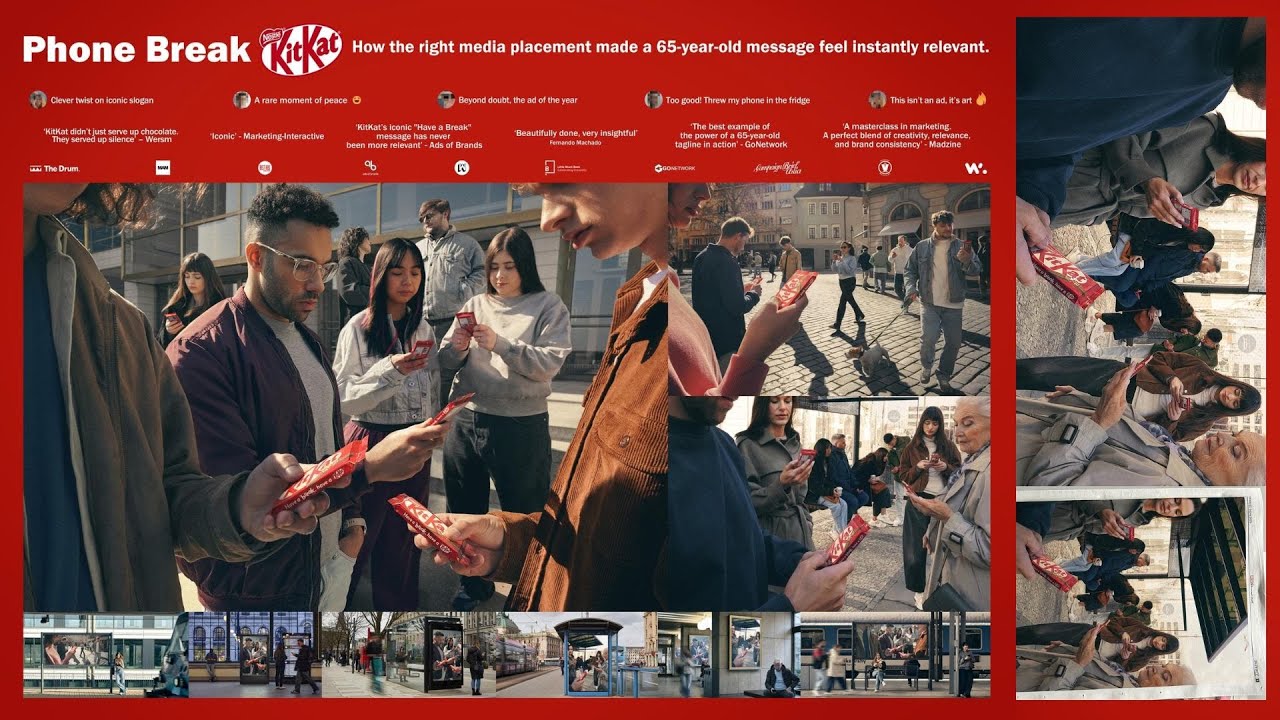 The concept emerged from a massive VML global internal pitch featuring over 400 submissions from around the world. The Prague office won by leaning into "brutal simplicity," identifying that the physical oblong shape of a KitKat bar is almost identical to a modern smartphone. This visual "uncanny valley" allowed the team to execute the campaign with no logo, no tagline, and no copy. By relying entirely on the brand’s iconic red packaging and shape, they proved that KitKat’s brand codes are so deeply ingrained in culture that words were unnecessary.