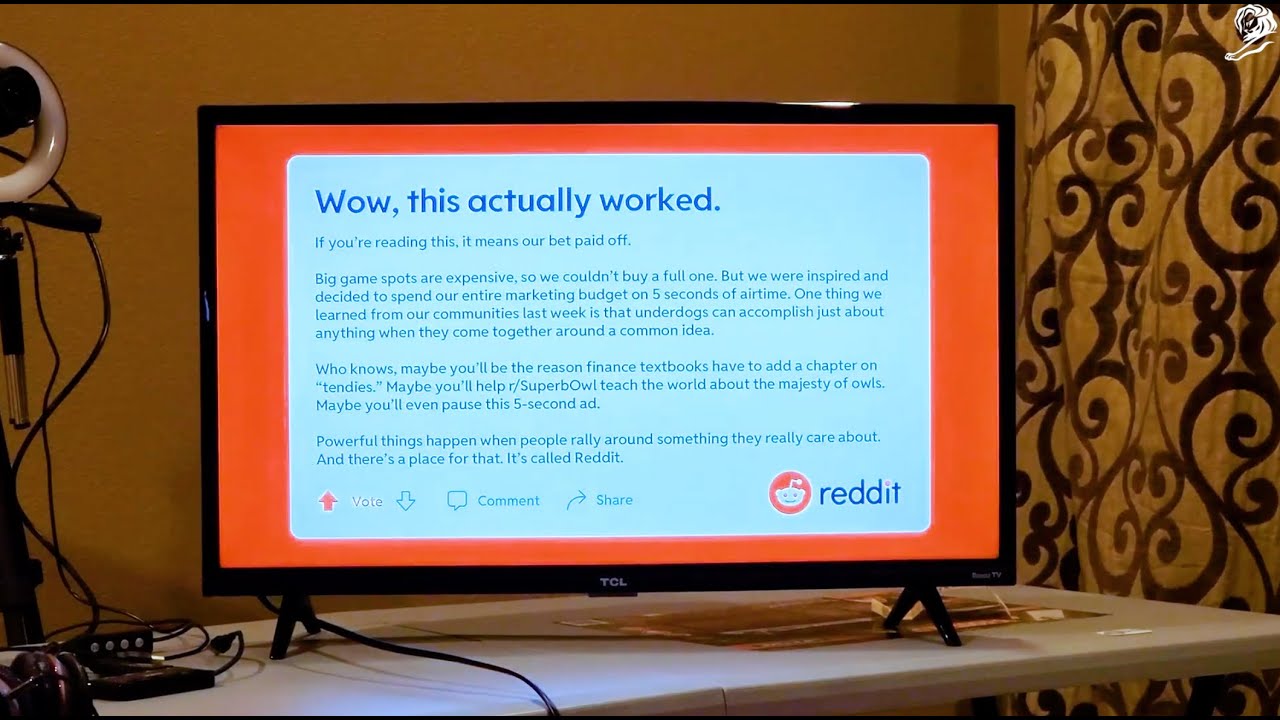 While a national 30 - second spot in 2021 cost $5.5 million, Reddit and R/GA executed a strategic "hack" by purchasing a regional buy for approximately $915,000. By targeting nine major U.S. markets - including New York, Los Angeles, and Chicago - the brand achieved 17.2 million household impressions at a fraction of the cost. The "janky" static slide was intentionally designed to look like a broadcast glitch, starting with a "Please Stand By" card to grab attention. This "pause" strategy worked: Reddit became the #2 most searched ad of the day, driving a 25% spike in site traffic and generating over 6.5 billion earned impressions.